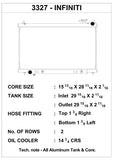 CSF has over 5 decades of experience manufacturing radiators. So when it comes to keeping your engine cool and your G35 running at its best, a CSF High-Performance All-Aluminum Radiator is the obvious choice. Designed to perform on the street or at the track, a performance radiator is a must-have for both high horsepower builds as well as race vehicles which need added cooling performance in motorsports environments. This radiator features a 2-Row core with CSF's exclusive B-Tube Technology: Unlike a regular oval shape "O" type radiator tube, CSF uses a specially engineered tube in the shape of a "B". These "B-tubes" are carefully formed and then brazed over the seam to seal. CSF is able to use thinner and lighter aluminum material (with better cooling efficiency) because this design is actually stronger than normal "O" shape tubes that are welded. The design (inlet in the middle of the tube that is seam brazed) increases the heat transfer surface area of the tubes by approximately 15% over regular tubes - producing the efficiency of two smaller tubes vs. one large tube within the same space criteria. With "B-tubes" you are able to get "dual liquid laminar flow". CSF also uses ultra efficient multi louvered fins that are carefully and precisely aligned to maximize airflow through each radiator core. Fin specifications are carefully measured and calculated for each application, and tested for maximum heat rejection efficiency in our wind-tunnel lab.This Part Fits: