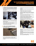 Mishimoto has developed a performance aluminum radiator available for the 2010-13 V6 Hyundai Genesis Coupe.This is the ideal upgrade to your stock Genesis Coupe radiator.Having a high-displacement V6 produces a great amount of heat; by replacing your current Hyundai Genesis radiator with a top of the line Mishimoto performance aluminum radiator you will undoubtedly notice a cooler, more efficient running engine.Our testing showed a 30 degree decrease in temperatures over stock.The new application is specifically designed and engineered as a direct OEM fit with no modification required for easy installation.Technical Bulletin