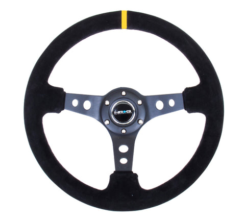 NRG Reinforced Steering Wheel (350mm / 3in. Deep) Blk Suede w/Circle Cut Spokes & Single Yellow CM